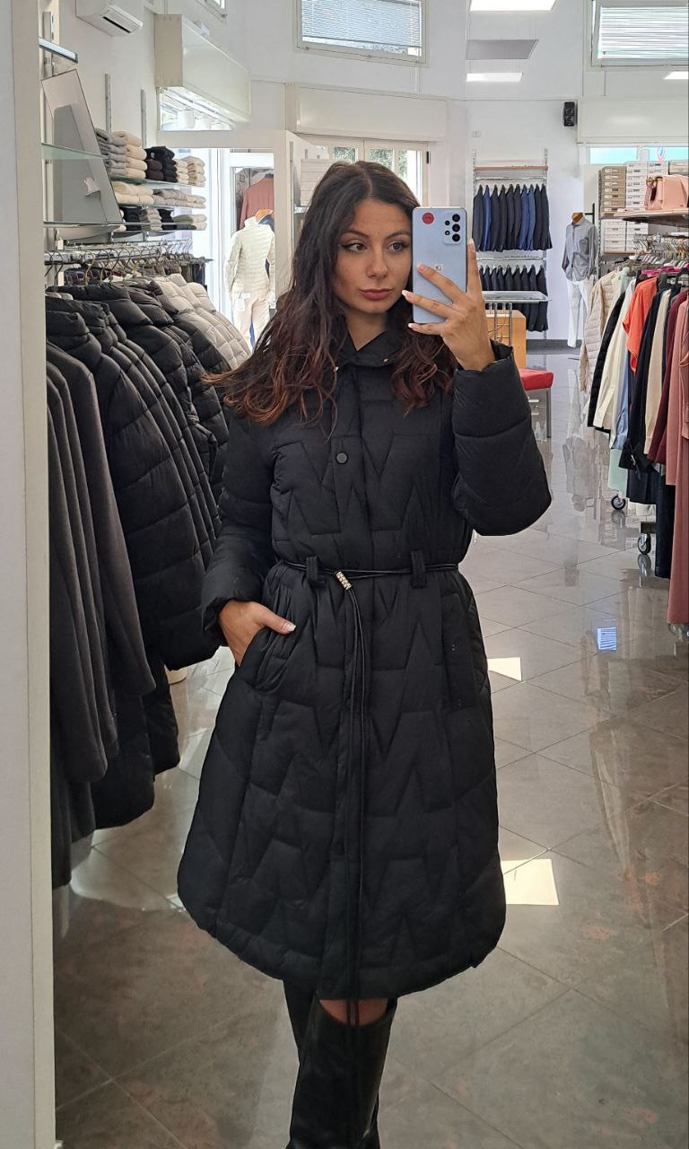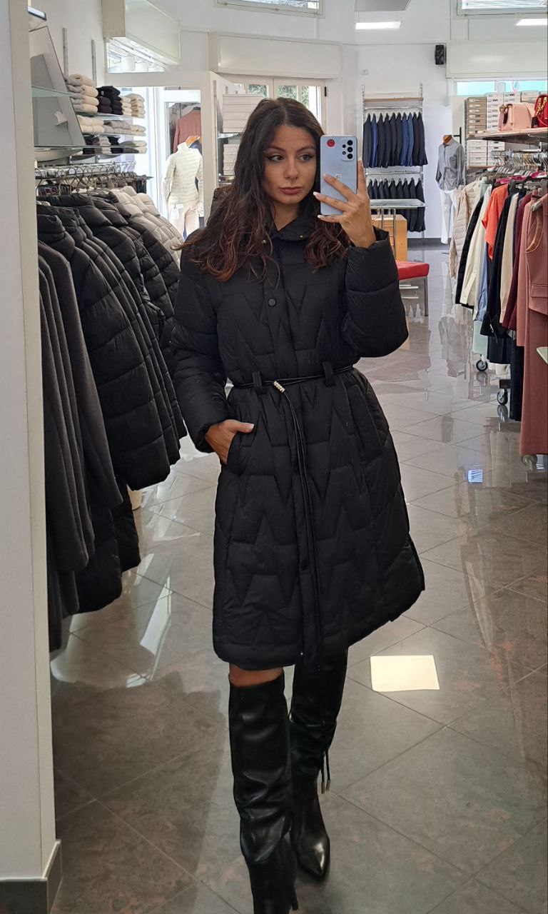 Un capo versatile ed elegante questo piumino lungo con cappuccio e chiusura con bottoni automatici, ideale per affrontare con eleganza il rigore invernale. La cintura in vita permette di personalizzare la silhouette.